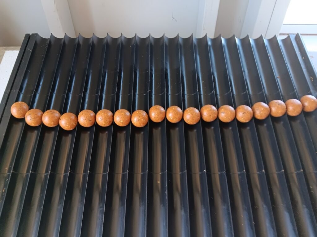 A rolling table works by taking a sausage of paste and rolling it between two matching groove faces until it rounds itself into individual baits.