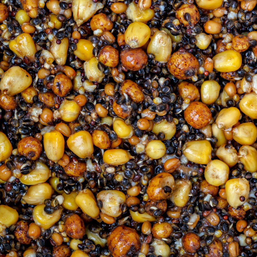 - Maize (corn): the backbone (cheap, visible, holds fish)